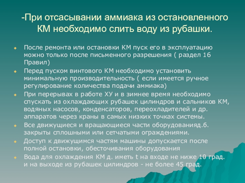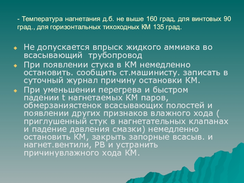 Перегрев паров аммиака, всасываемых КМ, д.б.не менее 5 град для одноступенчатых и с.в.д. 2 ступенчатых КМ.