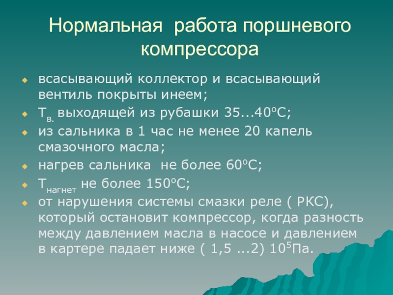 При уменьшении перегрева и быстром падении t нагнетаемых КМ паров, обмерзаниястенок всасывающих полостей и появлении других признаков влажного хода ( приглушенный стук в нагнетательных клапанах и падение давления смазки) немедленно остановить КМ, закрыть запорные всасыв. и нагнет.вентили, РВ и устранить причинувлажного хода КМ.
