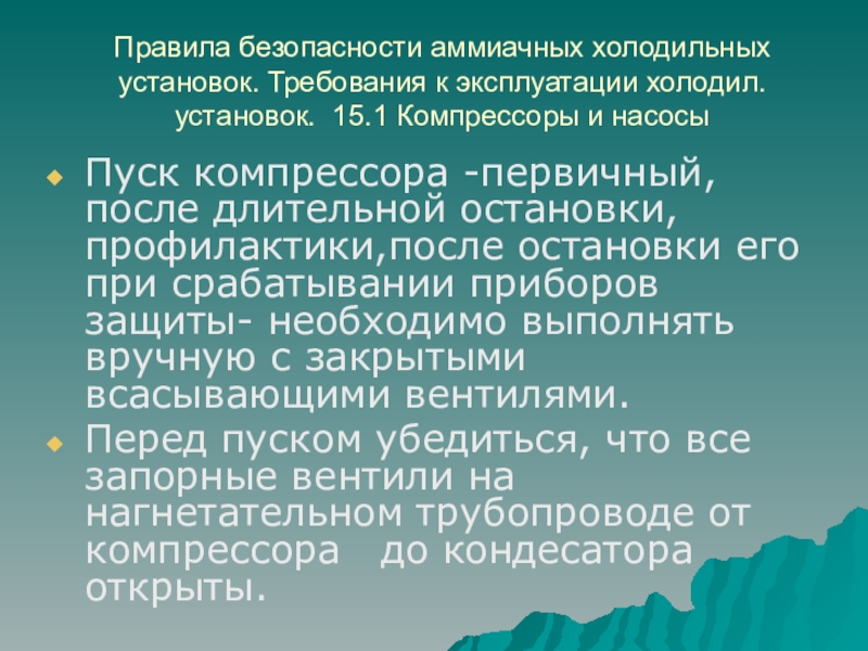 Пуск компрессора -первичный,после длительной остановки,профилактики,после остановки его при срабатывании приборов защиты- необходимо выполнять вручную с закрытыми всасывающими вентилями.