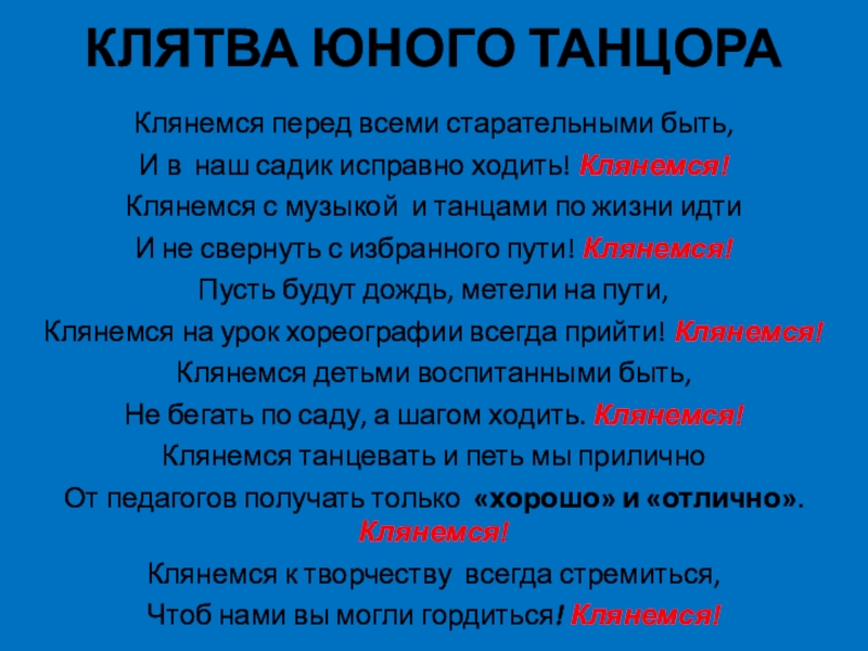 КЛЯТВА ЮНОГО ТАНЦОРАКлянемся перед всеми старательными быть,И в наш садик исправно ходить! Клянемся!Клянемся с музыкой и танцами