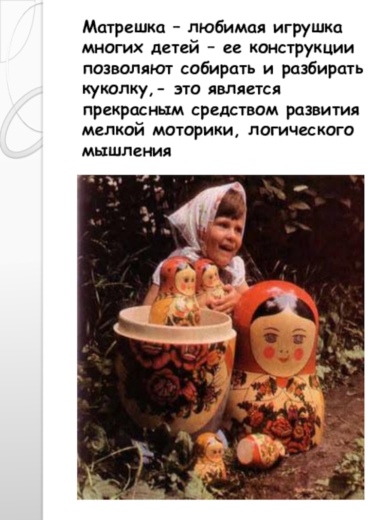 Слайд 16Матрешка – любимая игрушка многих детей – ее конструкции позволяют собирать