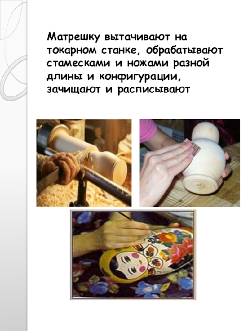 Слайд 7Матрешку вытачивают на токарном станке, обрабатывают стамесками и ножами разной длины