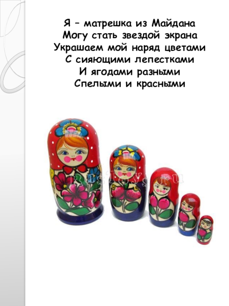 Я – матрешка из Майдана Могу стать звездой экрана Украшаем мой наряд цветами С сияющими лепестками И