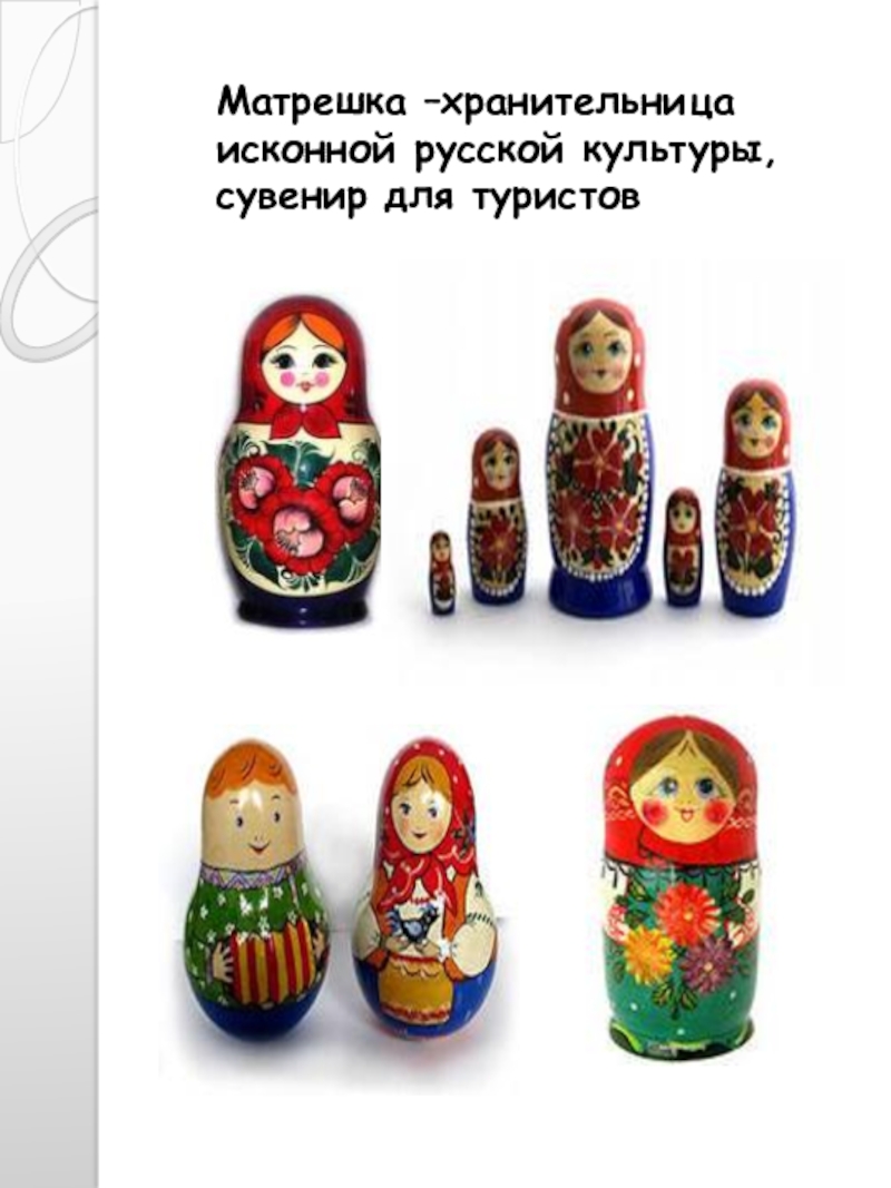Слайд 15Матрешка –хранительница исконной русской культуры, сувенир для туристов
