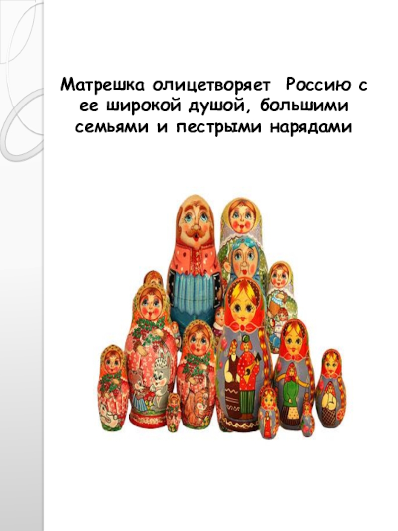 Слайд 8Матрешка олицетворяет Россию с ее широкой душой, большими семьями и пестрыми