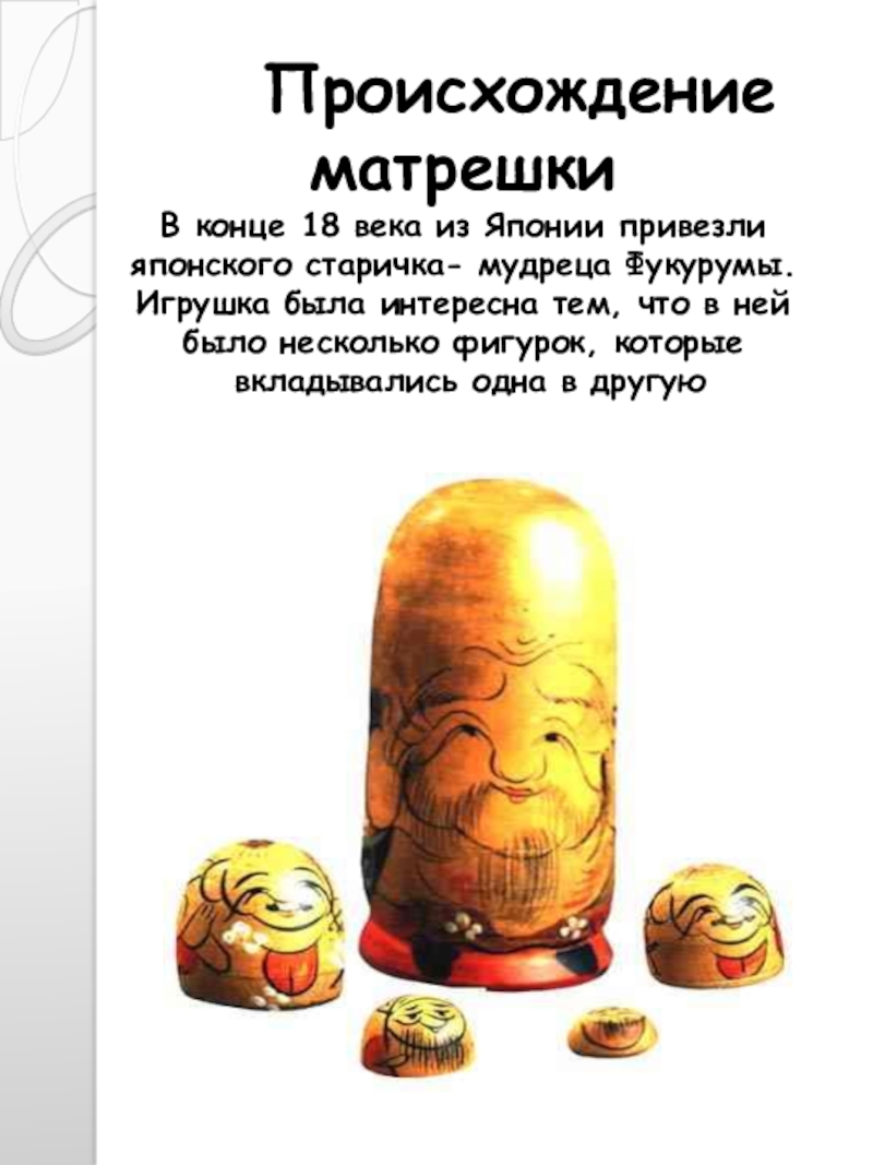Происхождение     матрешки В конце 18 века из Японии привезли японского старичка-
