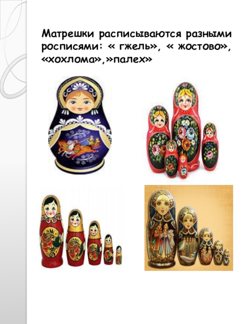 Слайд 13Матрешки расписываются разными росписями: « гжель», « жостово», «хохлома»,»палех»