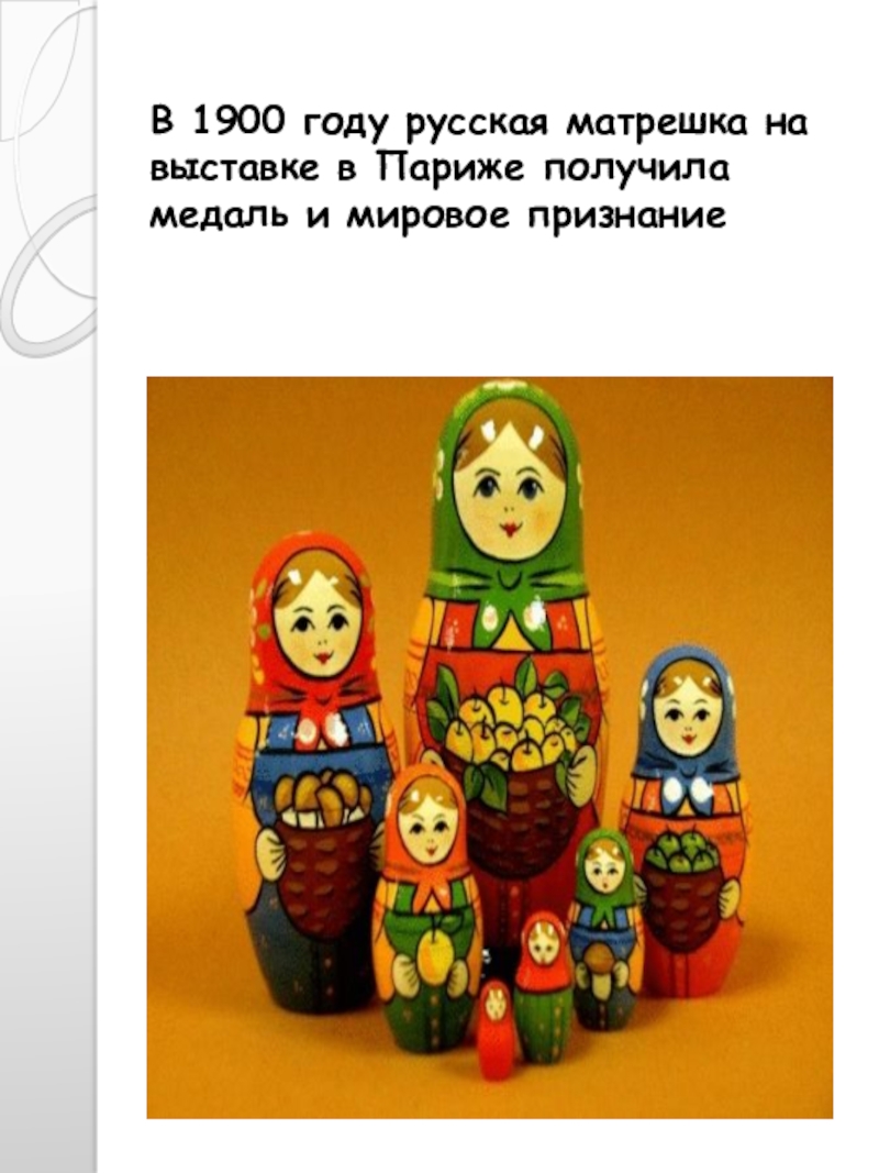 Слайд 17В 1900 году русская матрешка на выставке в Париже получила медаль