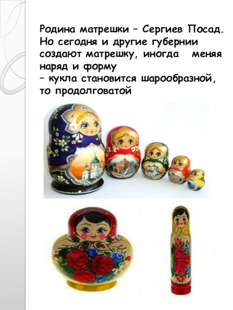 Родина матрешки – Сергиев Посад. Но сегодня и другие губернии создают матрешку, иногда  меняя наряд и