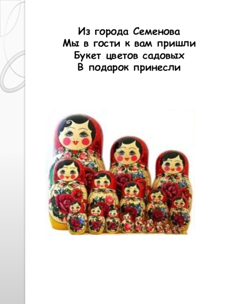 Из города Семенова Мы в гости к вам пришли Букет цветов садовых  В подарок принесли