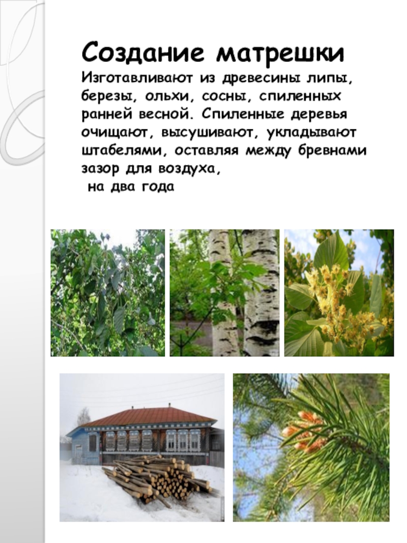 Создание матрешки Изготавливают из древесины липы, березы, ольхи, сосны, спиленных ранней весной. Спиленные деревья очищают, высушивают, укладывают