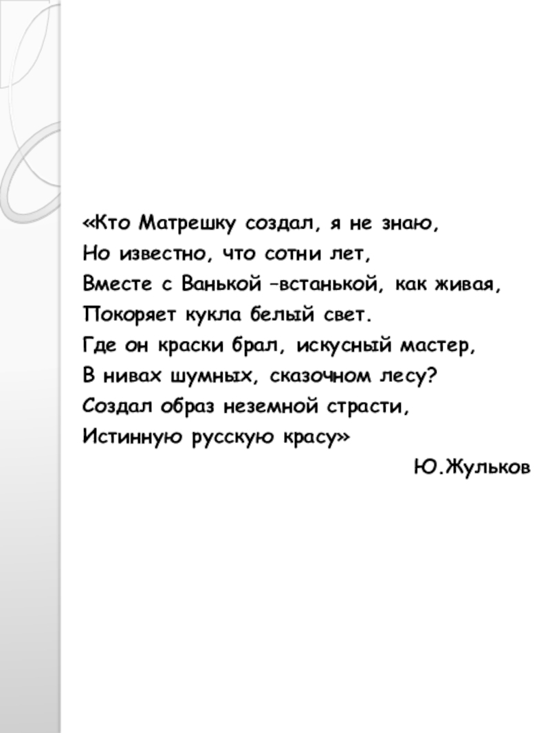 «Кто Матрешку создал, я не знаю,Но известно, что сотни лет,Вместе с Ванькой –встанькой, как живая,Покоряет кукла белый свет.Где он краски брал, искусный мастер,В нивах шумных, сказочном лесу?Создал образ неземной страсти,Истинную русскую красу»Ю.Жульков