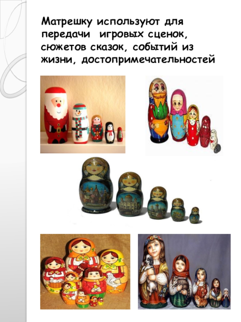 Матрешку используют для передачи игровых сценок, сюжетов сказок, событий из  жизни, достопримечательностей