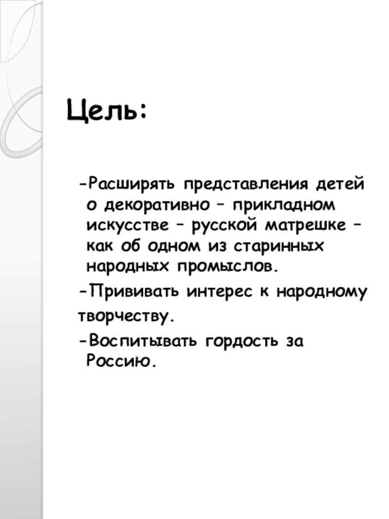 Цель: -Расширять представления детей о декоративно – прикладном искусстве – русской матрешке –  как об одном