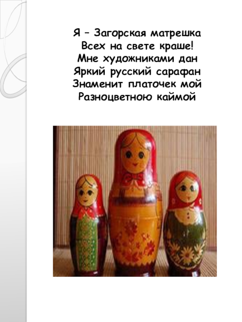 Я – Загорская матрешка Всех на свете краше! Мне художниками дан  Яркий русский сарафан Знаменит платочек