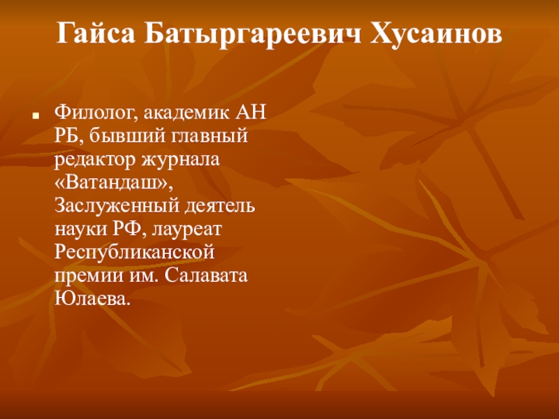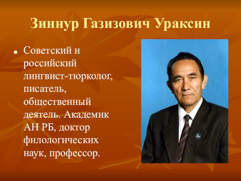 Филолог, академик АН РБ, бывший главный редактор журнала «Ватандаш»,