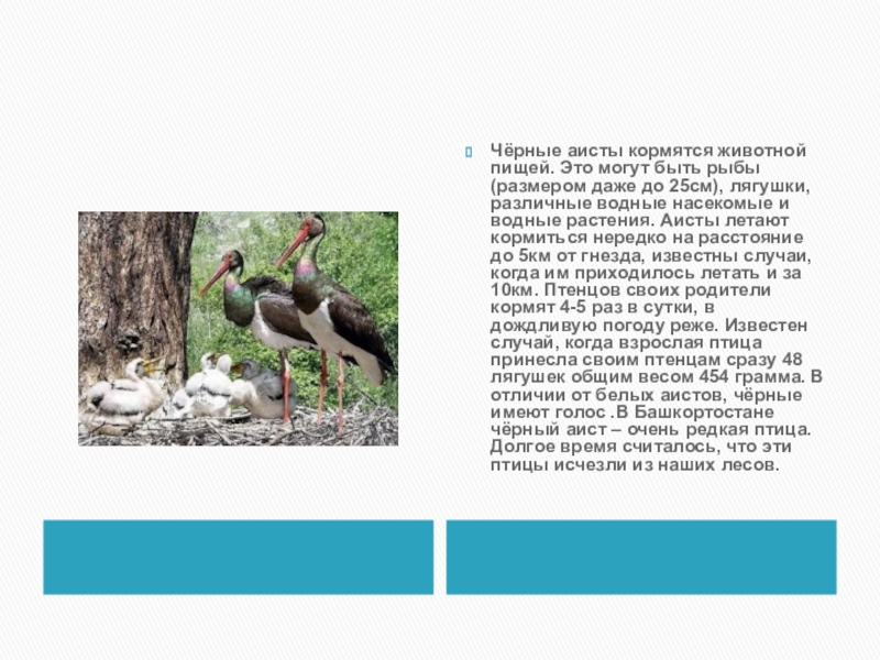 Слайд 6Чёрные аисты кормятся животной пищей. Это могут быть рыбы (размером даже