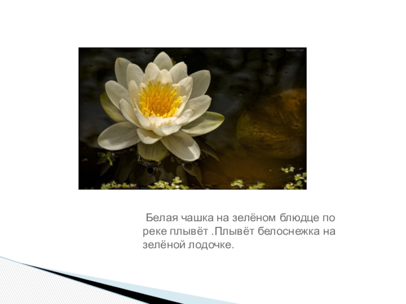 Слайд 10 Белая чашка на зелёном блюдце по реке плывёт .Плывёт белоснежка на