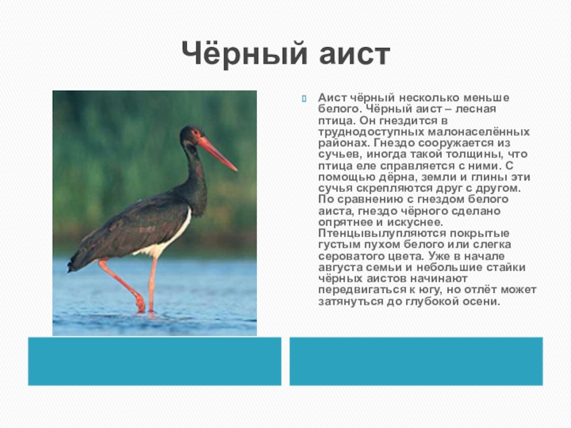 Чёрный аистАист чёрный несколько меньше белого. Чёрный аист – лесная птица. Он гнездится в труднодоступных малонаселённых районах.