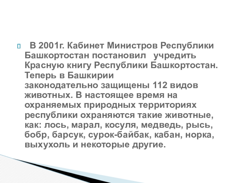 Слайд 3  В 2001г. Кабинет Министров Республики Башкортостан постановил   учредить Красную книгу Республики
