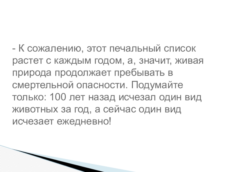 значит, живая природа продолжает пребывать в смертельной опасности. Подумайте только: 100 лет назад исчезал один вид животных за год, а сейчас один вид исчезает ежедневно!