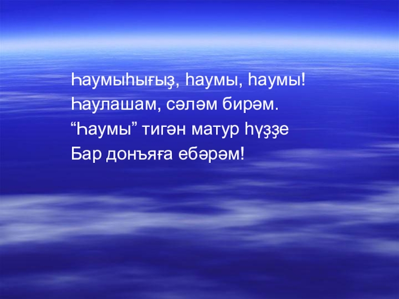 Һаумыһығыҙ, һаумы, һаумы!Һаулашам, сәләм бирәм.“Һаумы” тигән матур һүҙҙеБар донъяға ебәрәм!