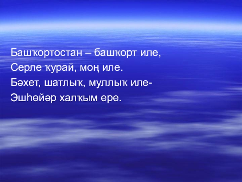 Башҡортостан – башҡорт иле,Серле ҡурай, моң иле.Бәхет, шатлыҡ, муллыҡ иле-Эшһөйәр халҡым ере.