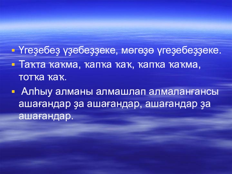 Слайд 2Үгеҙебеҙ үҙебеҙҙеке, мөгөҙө үгеҙебеҙҙеке.