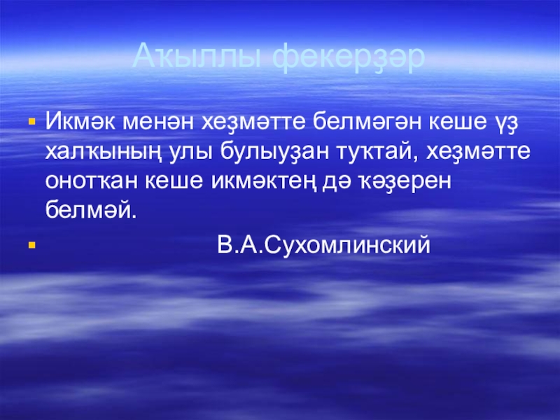 Аҡыллы фекерҙәрИкмәк менән хеҙмәтте белмәгән кеше үҙ халҡының улы булыуҙан туҡтай, хеҙмәтте онотҡан кеше икмәктең дә ҡәҙерен