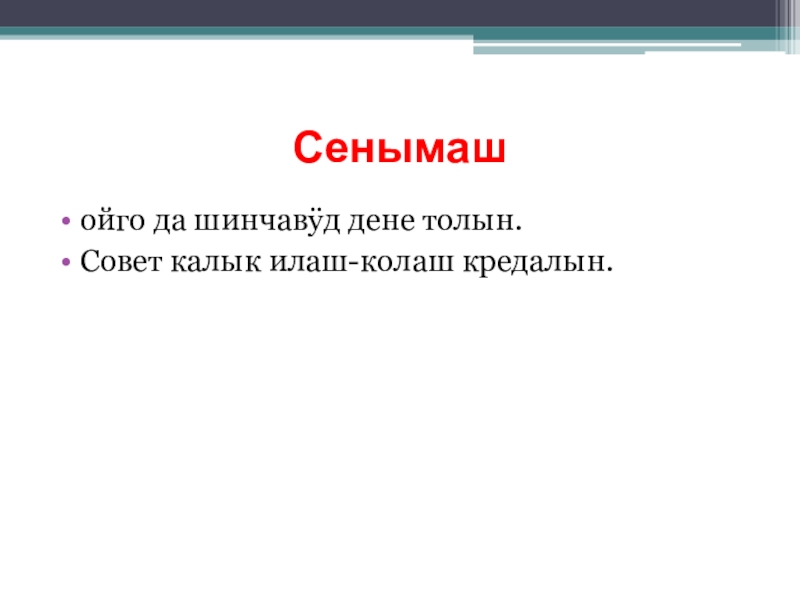 Сенымашойго да шинчавÿд дене толын.Совет калык илаш-колаш кредалын.