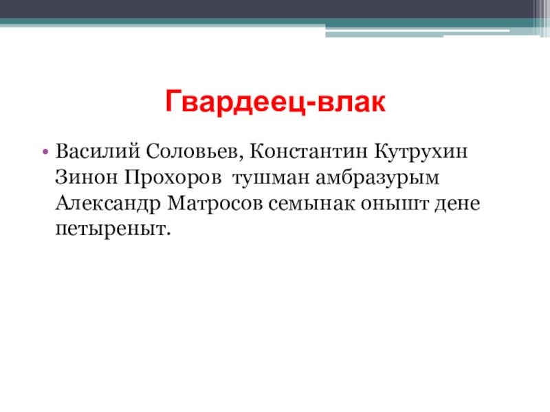 Гвардеец-влакВасилий Соловьев, Константин Кутрухин Зинон Прохоров тушман амбразурым Александр Матросов семынак онышт дене петыреныт.