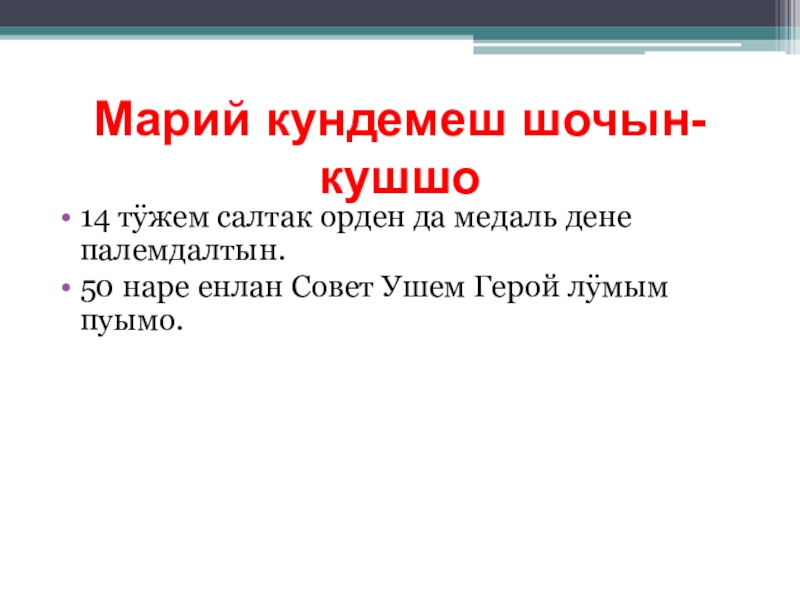 Марий кундемеш шочын-кушшо14 тÿжем салтак орден да медаль дене палемдалтын.50 наре енлан Совет Ушем Герой лÿмым пуымо.