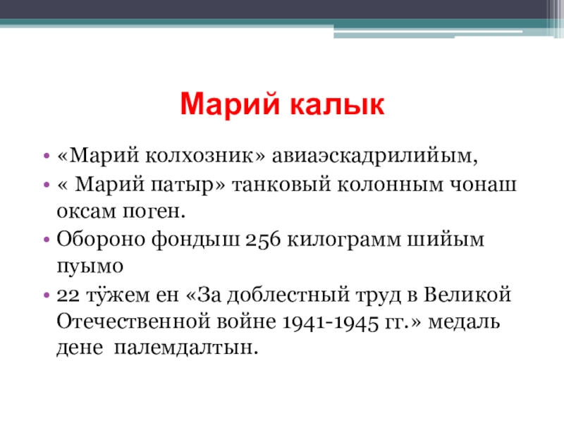 Марий калык«Марий колхозник» авиаэскадрилийым,« Марий патыр» танковый колонным чонаш оксам поген.Обороно фондыш 256 килограмм шийым пуымо22 тÿжем