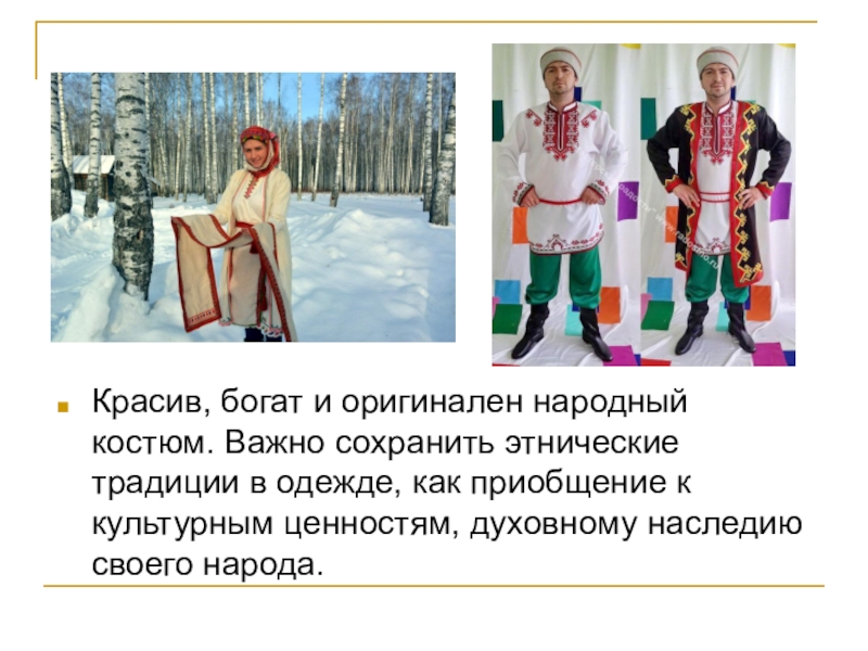 Слайд 20Красив, богат и оригинален народный костюм. Важно сохранить этнические традиции в