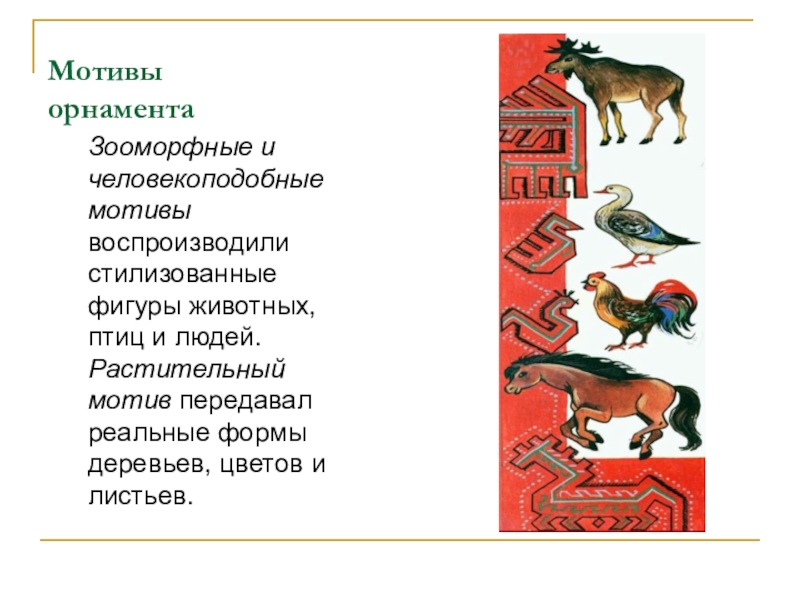 Зооморфные и человекоподобные мотивы воспроизводили стилизованные фигуры животных, птиц и