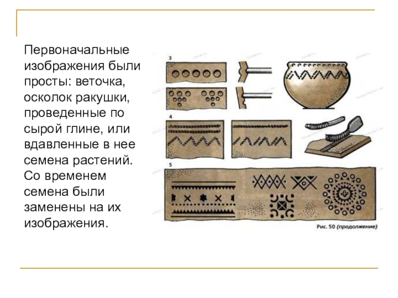 Слайд 7Первоначальные изображения были просты: веточка, осколок ракушки, проведенные по сырой глине,