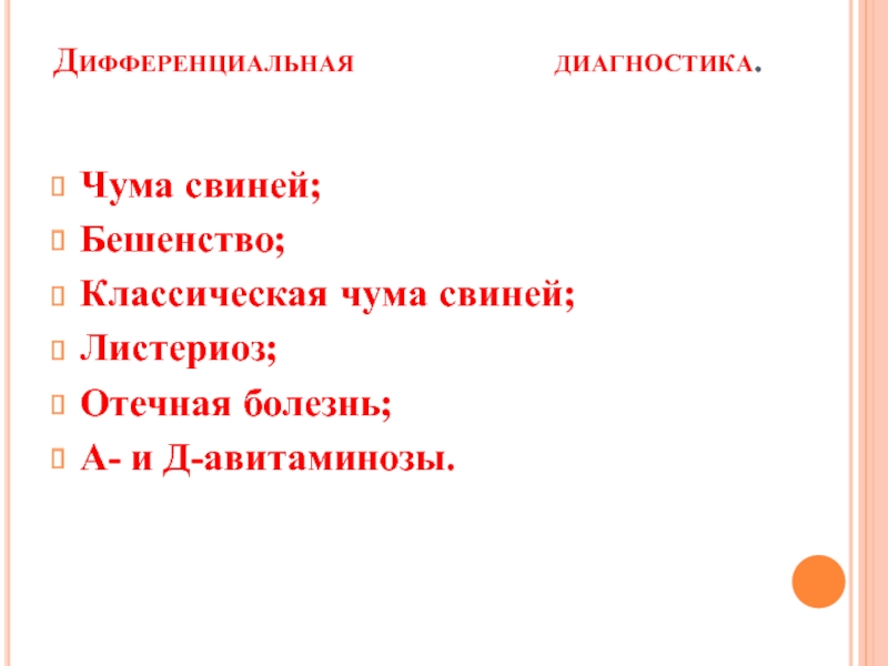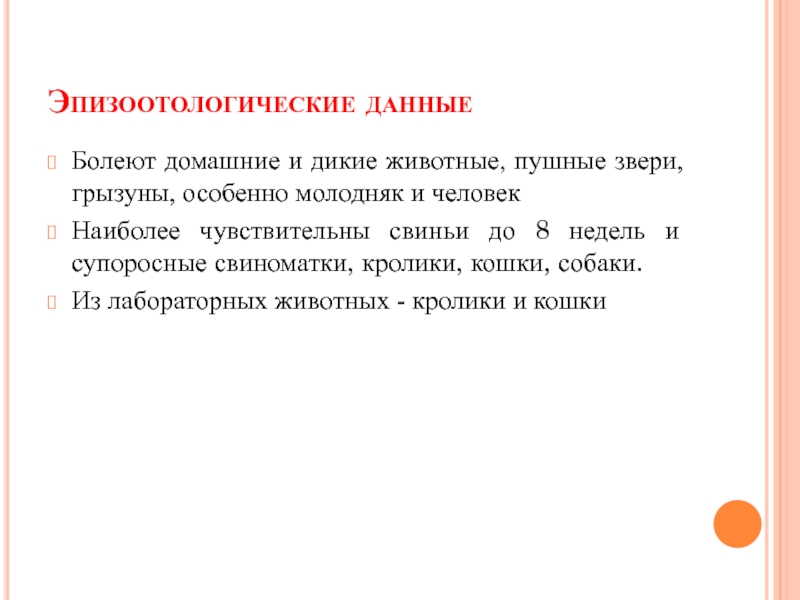 Наиболее чувствительны свиньи до 8 недель и супоросные свиноматки, кролики, кошки, собаки.