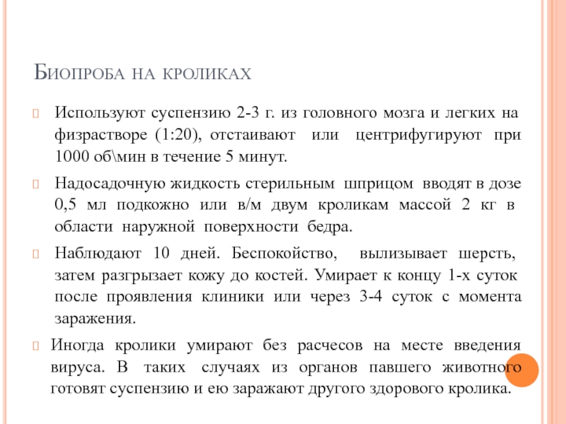 Иногда кролики умирают без расчесов на месте введения вируса. В таких случаях из органов павшего животного готовят суспензию и ею заражают другого здорового кролика.