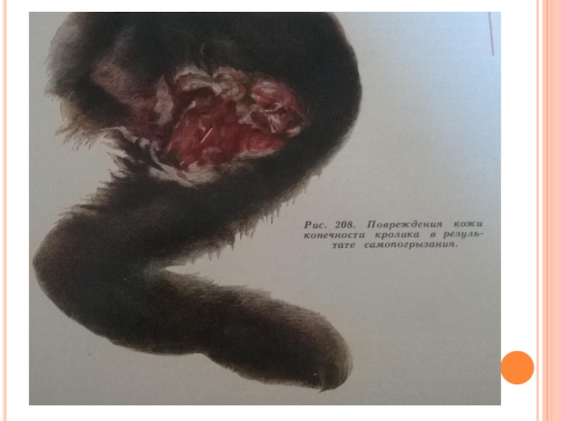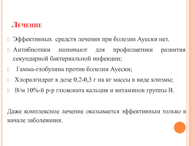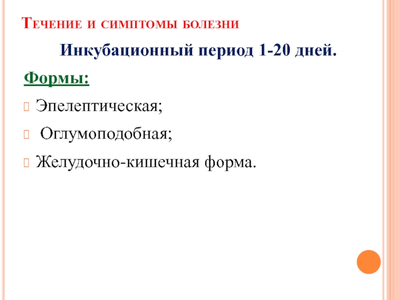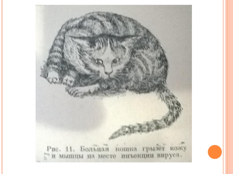 Наблюдают 10 дней. Беспокойство, вылизывает шерсть, затем разгрызает кожу до костей. Умирает к концу 1-х суток после проявления клиники или через 3-4 суток с момента заражения.