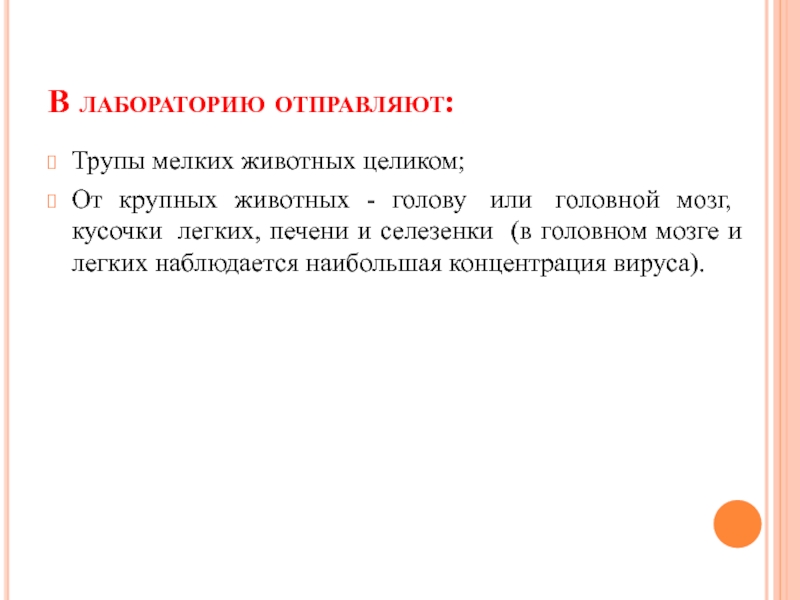 головной мозг, кусочки легких, печени и селезенки (в головном мозге и легких наблюдается наибольшая концентрация вируса).