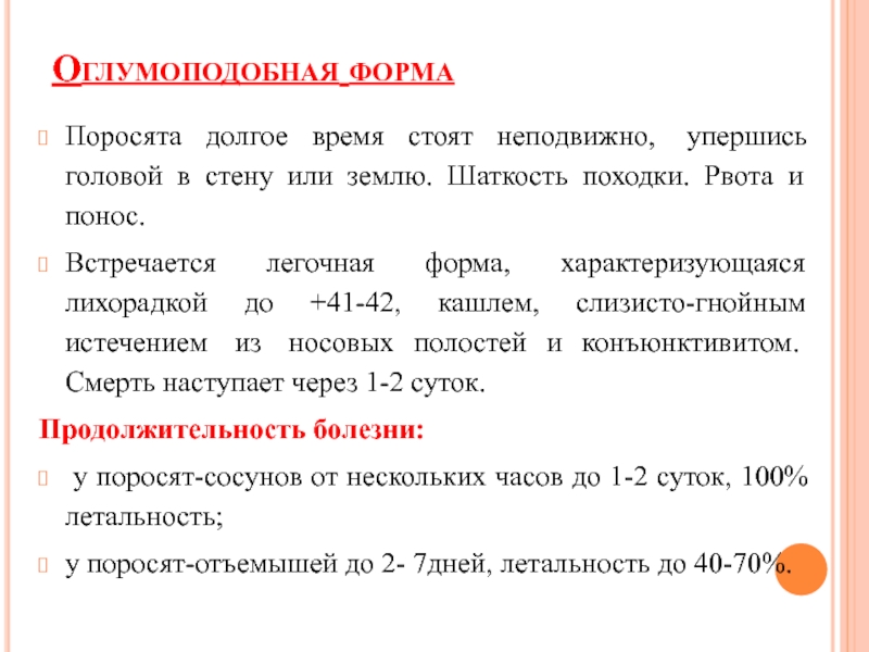 у поросят-отъемышей до 2- 7дней, летальность до 40-70%.