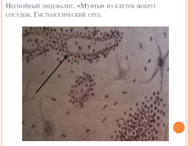 Слайд 21Негнойный энцефалит. «Муфты» из клеток вокруг сосудов. Гистологический срез.
