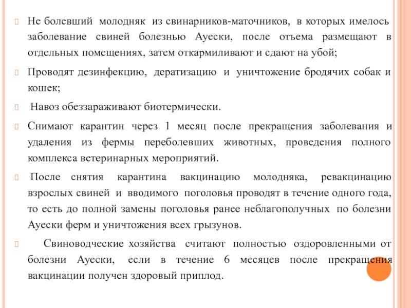 Слайд 27Не болевший молодняк из свинарников-маточников, в которых имелось заболевание свиней болезнью
