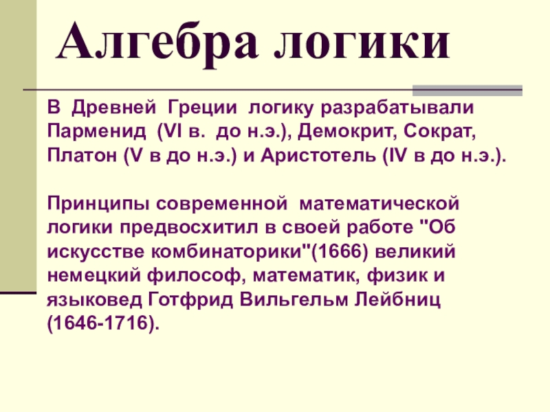 Первое упоминание логики встречается в китайской «Книге перемен» (VIII в до н.э.). В Древней Греции она начала разрабатываться в VI в до н.э. Немного позже логика возникла в Индии.