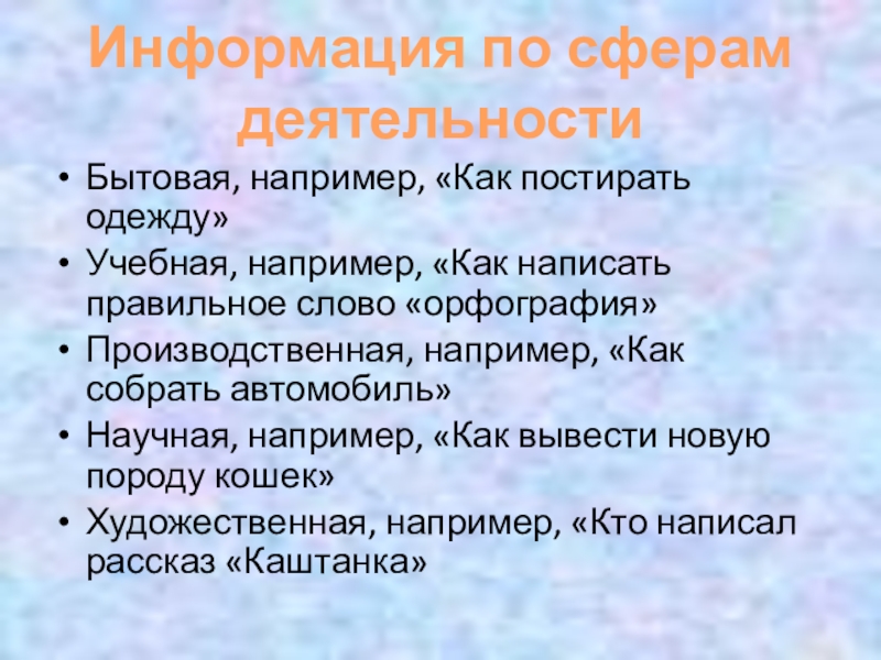 Информация по сферам деятельностиБытовая, например, «Как постирать одежду»Учебная, например, «Как написать правильное слово «орфография»Производственная, например, «Как собрать