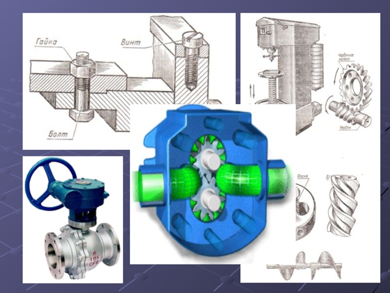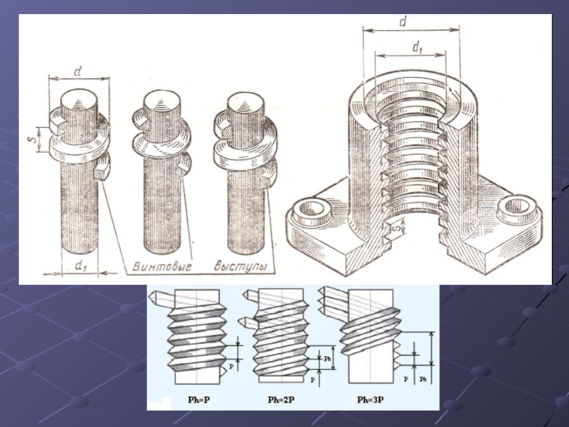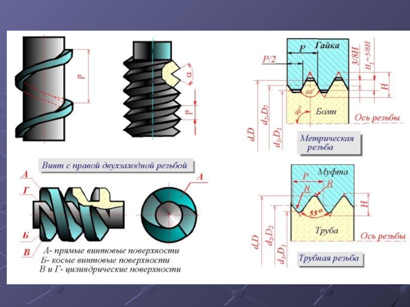 Презентация, доклад по инженерной графике на тему Винтовая линия на поверхности цилиндра и конуса. Основные сведения о резьбе. Типы резьб.