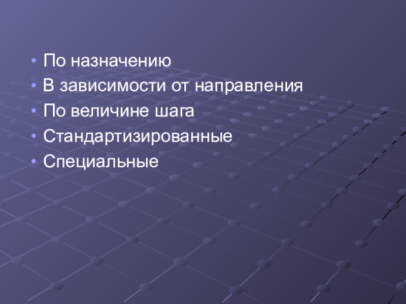 По назначениюВ зависимости от направленияПо величине шагаСтандартизированныеСпециальные