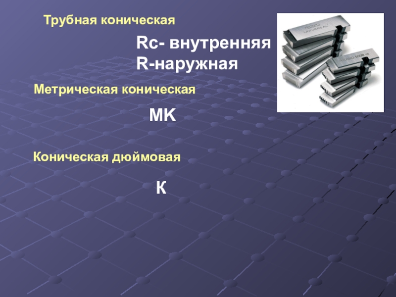 Трубная коническаяRc- внутренняяR-наружнаяМетрическая коническаяMKКоническая дюймоваяК