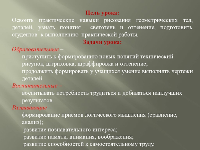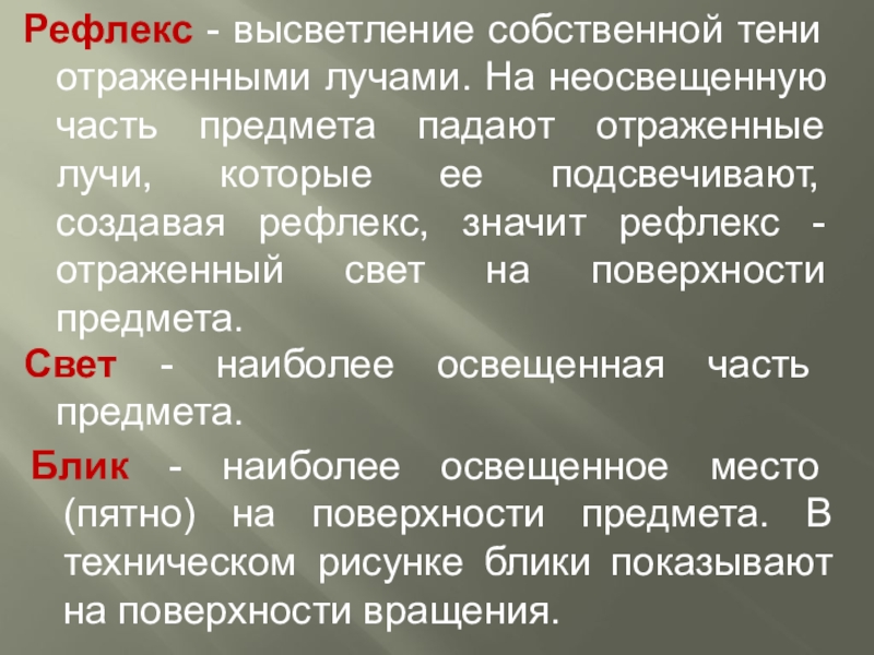 Блик - наиболее освещенное место (пятно) на поверхности предмета. В техническом рисунке блики показывают на поверхности вращения.