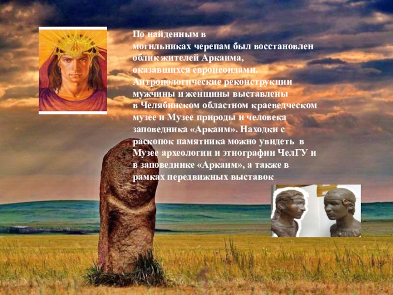 Слайд 6По найденным в могильниках черепам был восстановлен облик жителей Аркаима, оказавшихся европеоидами. Антропологические реконструкции
